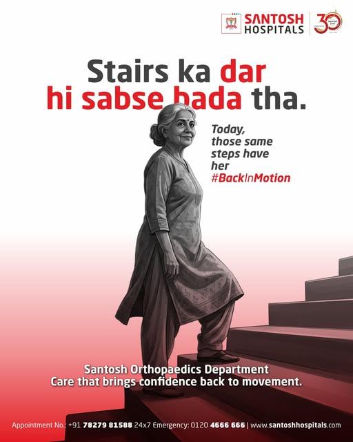 #SantoshHospitals #JointCare #ArthritisRelief #MobilityMatters #BackInMotion #HealthyLiving #Orthopedics #GhaziabadHealthcareDon't let joint pain decide your path. For a long time, she chose the longer route just to avoid the stairs or the steep slopes. But today, she walks with confidence, choosing the path she wants, not the one her pain dictates. At Santosh Joint & Arthritis Care, we believe age should never be a barrier to mobility. Whether it's a walk in the park or a trip to the market, we are here to get you #BackInMotion. Reclaim your freedom. Reclaim your life. Book your appointment today: +91 78279 81588 | Visit: www.santoshhospitals.com #SantoshHospitals #JointCare #ArthritisRelief #MobilityMatters #BackInMotion #HealthyLiving #Orthopedics #GhaziabadHealthcare0 Comments 0 Shares 289 Views 0 Reviews - A fracture may heal with time but complete recovery takes the right care, rehabilitation, and confidence to walk again.